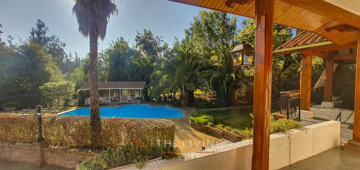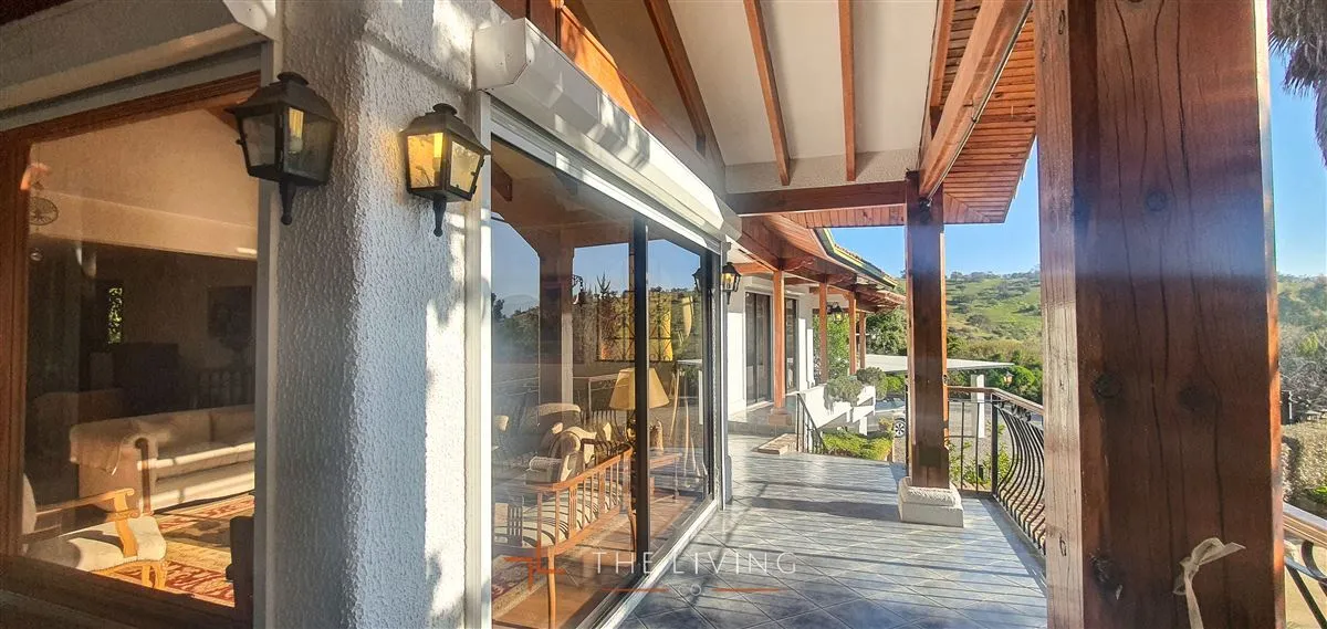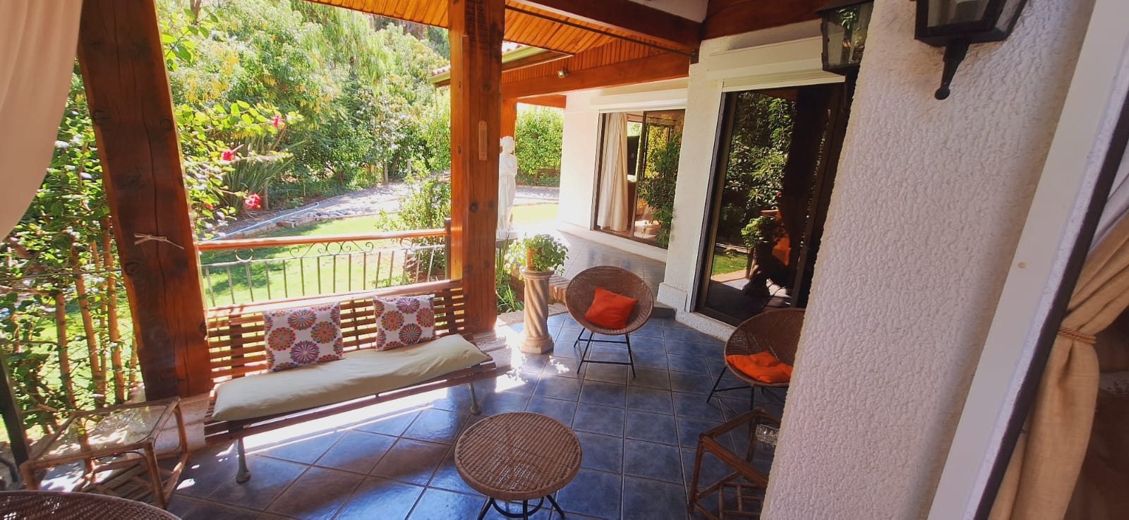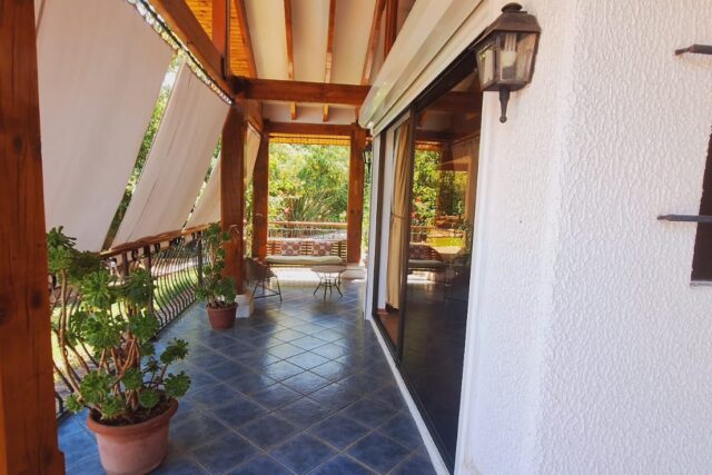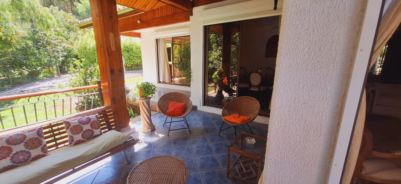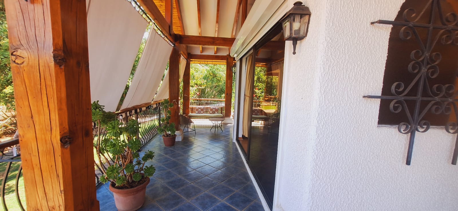 La casa se encuentra rodeada por una hermosa terraza con pilares de madera, desde donde se disfruta una vista despejada hacia la piscina, jardines consolidados y una pérgola cubierta, creando un espacio ideal para el descanso y la vida familiar.