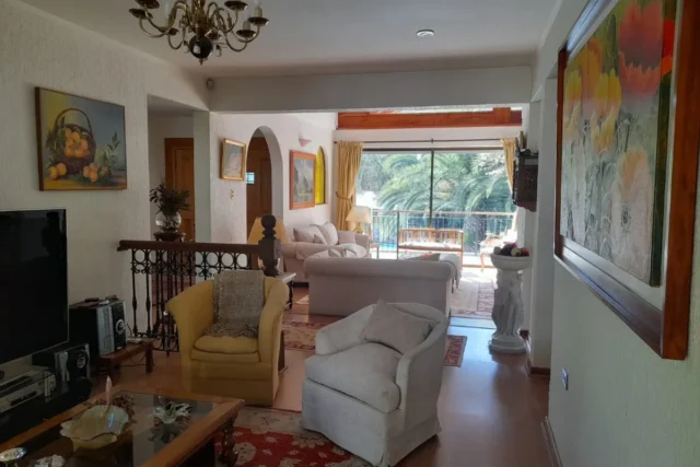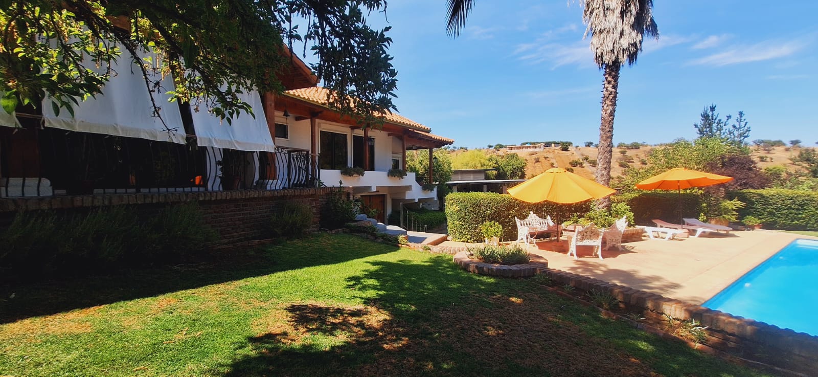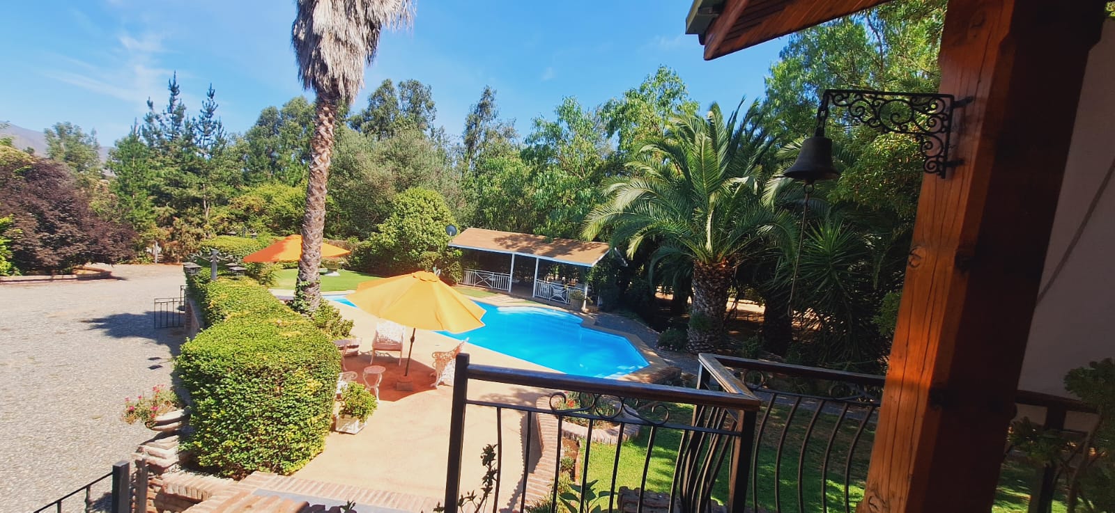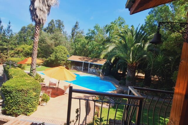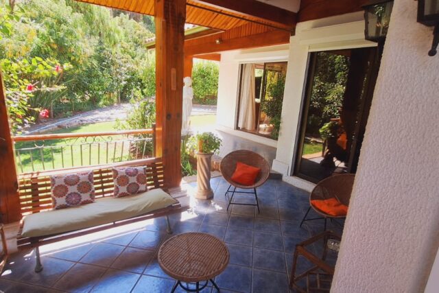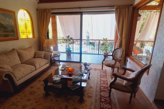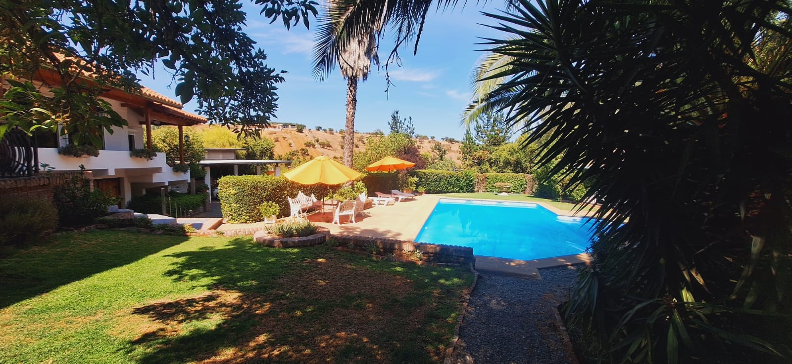 La casa se encuentra rodeada por una hermosa terraza con pilares de madera, desde donde se disfruta una vista despejada hacia la piscina, jardines consolidados y una pérgola cubierta, creando un espacio ideal para el descanso y la vida familiar.