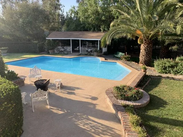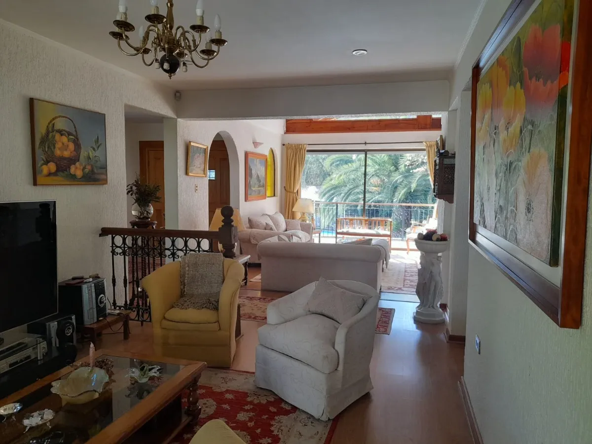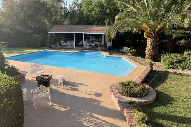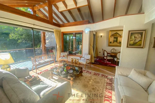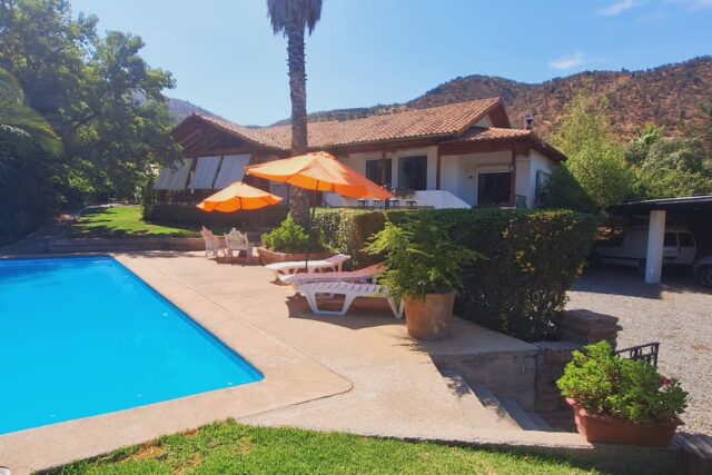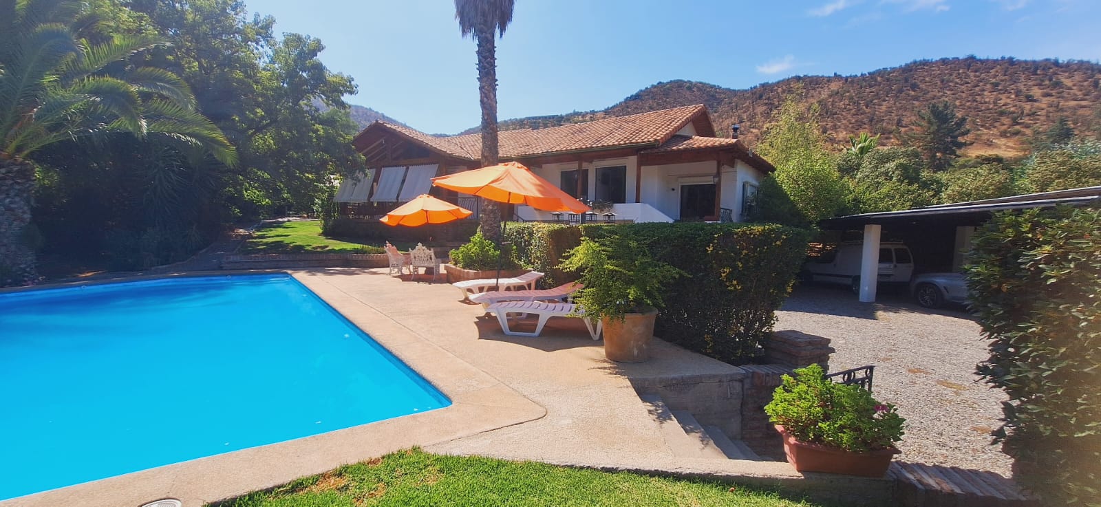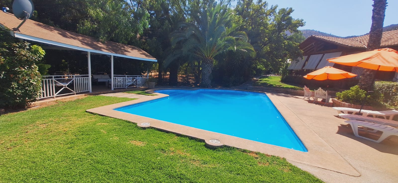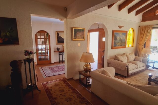 La casa se encuentra rodeada por una hermosa terraza con pilares de madera, desde donde se disfruta una vista despejada hacia la piscina, jardines consolidados y una pérgola cubierta, creando un espacio ideal para el descanso y la vida familiar.