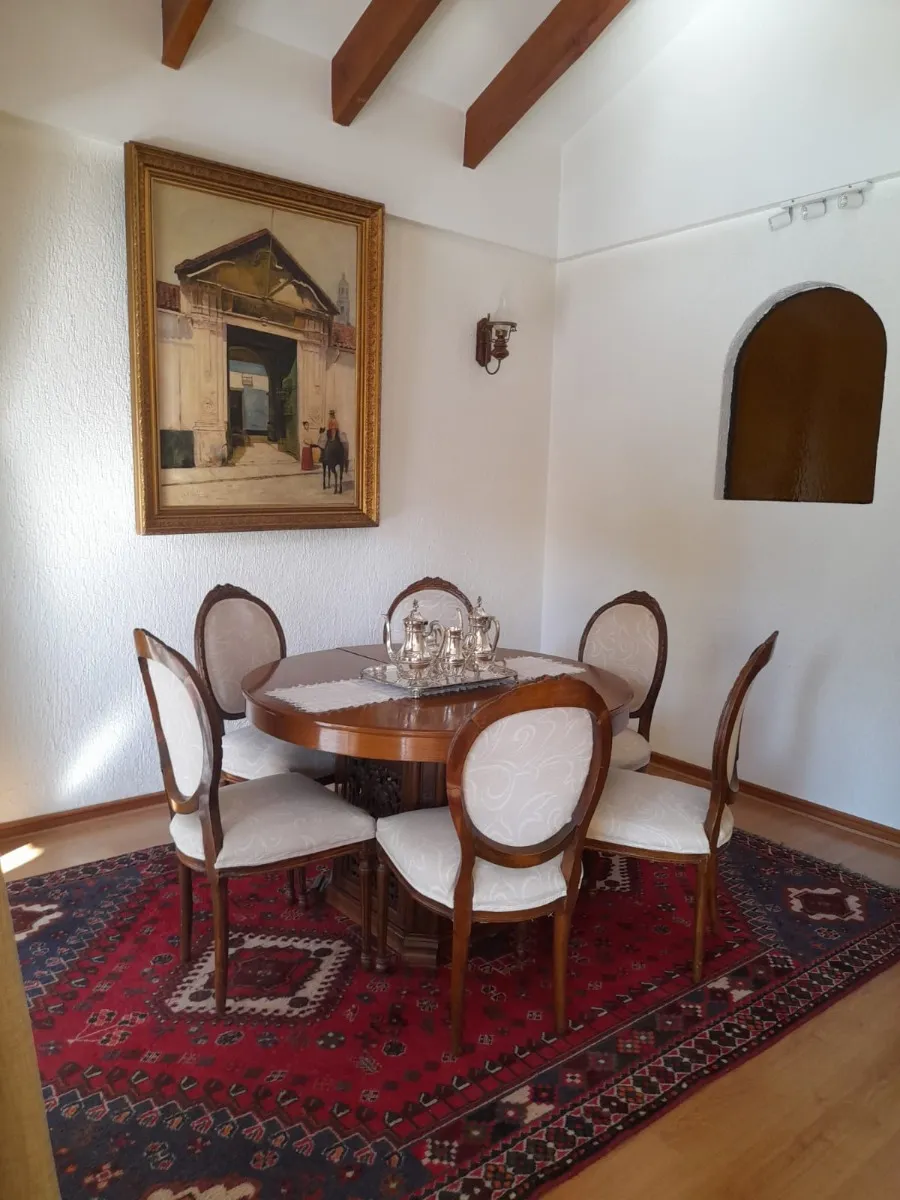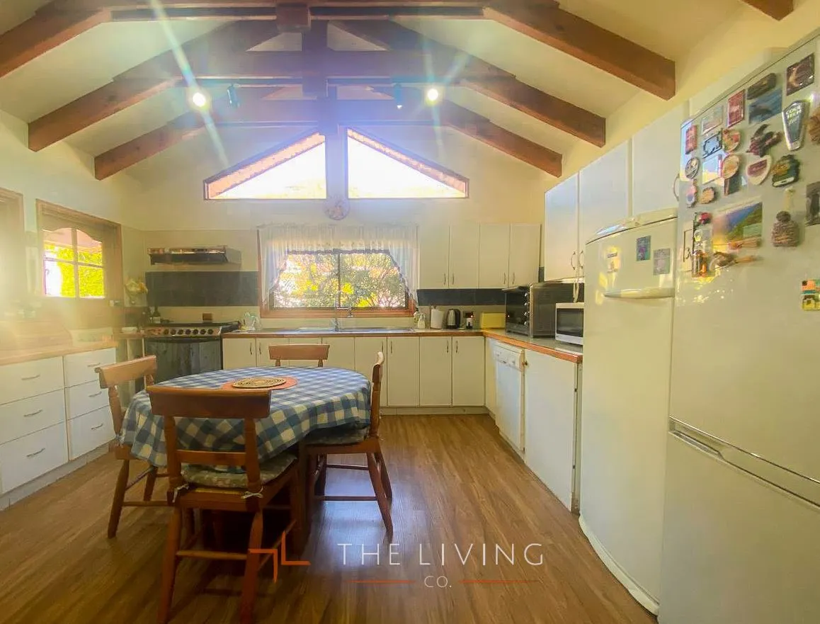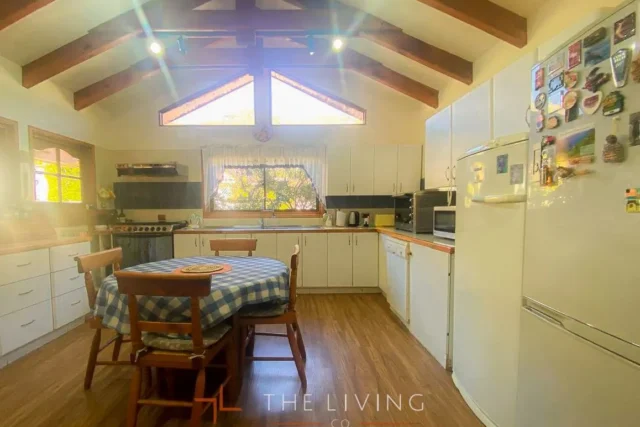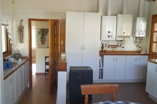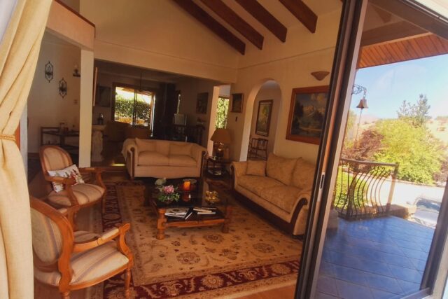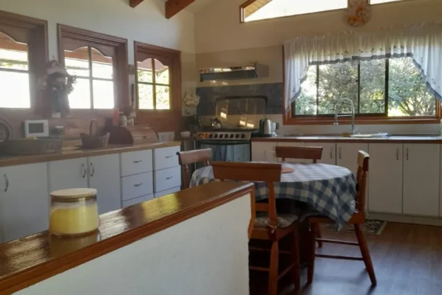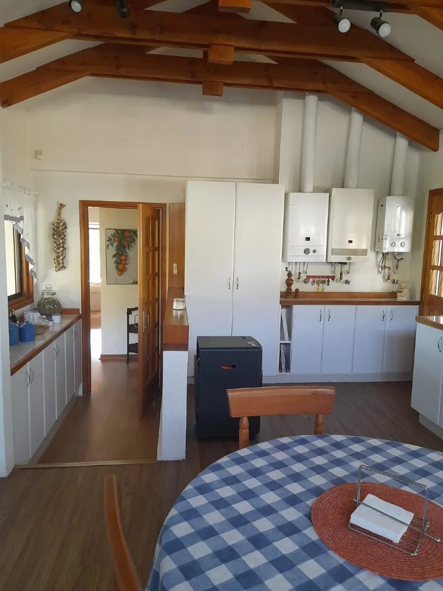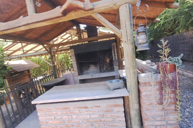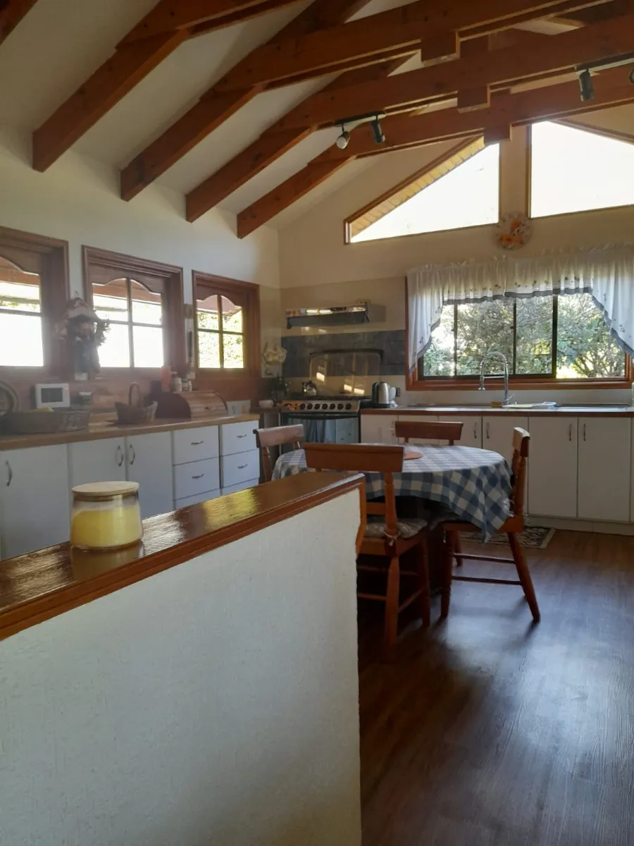 La cocina es amplia, con comedor de diario, y conecta directamente con un patio exterior con parrón y baño, ideal para actividades al aire libre. A continuación, la propiedad ofrece un gran huerto completamente cercado y un quincho, pensados para disfrutar de la vida en parcela.